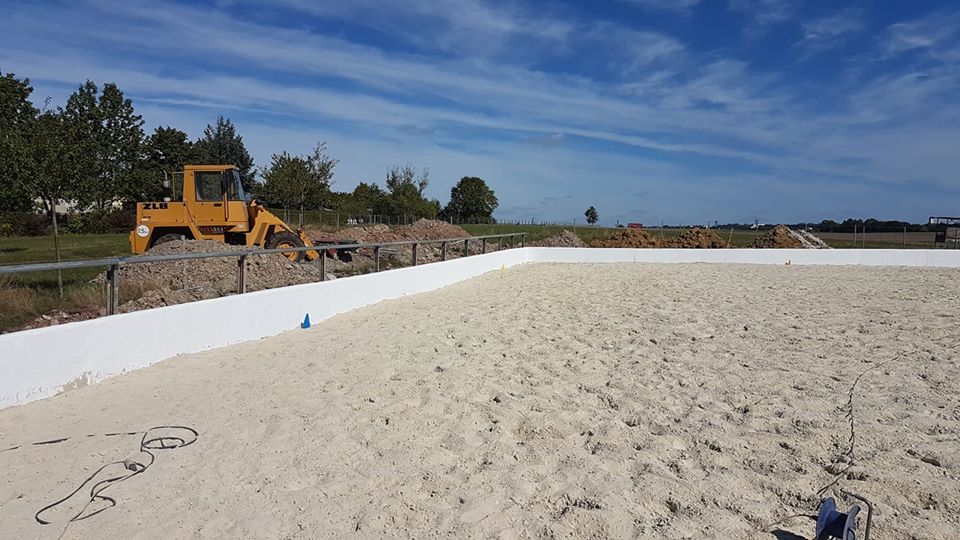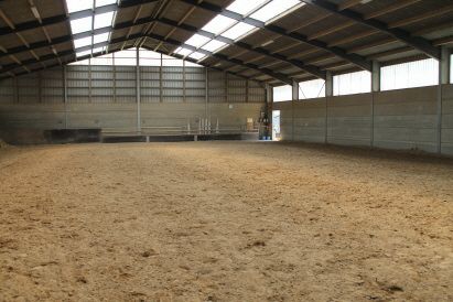 Die Reithalle (45x20 Meter) ist für sämtliche reiterliche Anforderungen geeignet, da der Hallenboden mit verschiedenen Gerätschaften mehrmals wöchentlich gepflegt wird. Außerdem stehen verschiedene Sprungständer, Cavalettis und weitere Trainingsgegenstände wie Dualgassen und Pylonen bereit. |